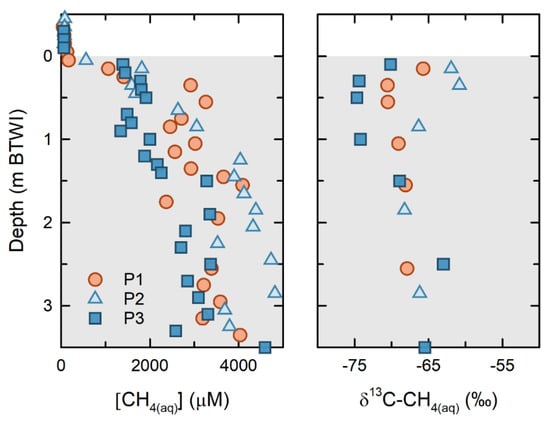 The extent of the impact of methane oxidation in removing dissolved methane from the water column can be evaluated using the observed shifts in δ13C-CH4(aq) for the timepoints where it could be measured. The isotopic compositions of methane within the FFT determined in 2016 were δ13C-CH4(aq) = −75 to −61‰ (Figure 4), and δ2H-CH4(aq) = −343 to −289‰ (Figure S2 in "Supplemental Information"), indicative of microbial methane production by fermentative pathways []. While it was not possible to assess the controls on the range of δ13C-CH4(aq) within the FFT with the data available, if it is assumed that the observed range is representative, then isotopic enrichment above this range within the water column can be considered to indicate the occurrence of fractionation during microbial methane oxidation [].