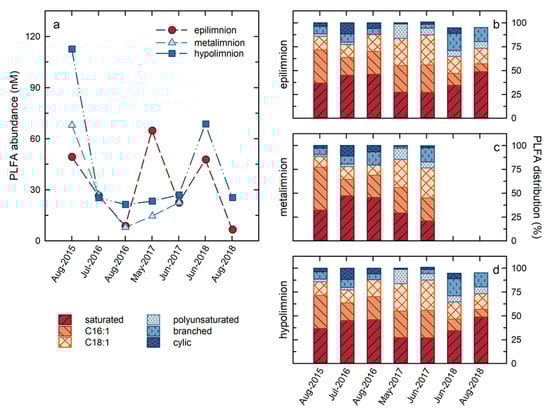 Total water column PLFA concentrations, indicative of cellular abundances, ranged from 5 to 112 µg mL−1 over the course of the study (Figure 5), corresponding to estimated cellular abundances of 2 × 105 to 5 × 106 cells/mL on the basis of a conversion factor of 4 × 104 pmol cell−1 []. These cellular abundances are similar to those reported in lakes ranging from Lake Erie [] and Lake Michigan [], to temperate lakes in Quebec [], and to dystrophic lakes in Poland [], as well as Lake Kinneret in Israel []. With the exception of the results for May 2017, the highest PLFA concentrations were consistently observed in the hypolimnion, consistent with the results of Risacher et al. (2018), and Arriaga et al. (2019), identifying the hypolimnion as the most microbiologically active zone in BML (Figure 5). Generally, the PLFA concentrations followed the same trend in both zones of the lake, with maximum concentrations observed in the earliest summer of the study, July 2015, and subsequently decreasing through 2016, and remaining consistent in 2017, with the notable exception of a spike in the PLFA concentrations observed in the epilimnion in May 2017. In 2018, there was an increase in the total PLFA in both zones in June, followed by a decrease in August 2018.