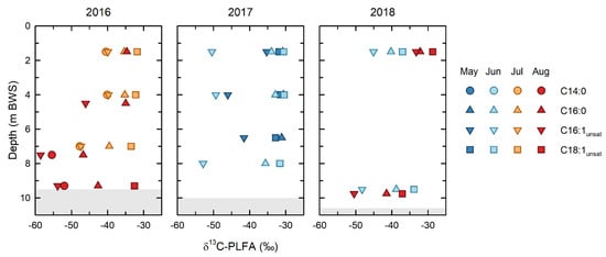 The isotopic depletion of the C16:1 PLFA, relative to the C18:1 and C16:0 PLFA (Figure 6), demonstrated that microbial methane oxidation occurred throughout the water column over the entirety of the study. This interpretation is based on the general patterns of isotopic depletion expected between microbial PLFA and their carbon sources. PLFA produced by heterotrophic bacteria in aerobic environments, such as the BML water column, are generally ~3‰ depleted, relative to their carbon source []. While stronger isotopic depletions are seen in PLFA produced by anaerobic organisms grown under certain conditions [], such anaerobic conditions were only observed in the BML water column in August in 2018 []. Because of the strongly isotopically depleted nature of methane, the PLFA of methanotrophs have been shown to be uniquely and strongly depleted in δ13C, and this can be a unique identifier of methanotrophy []. When applying this PLFA approach in the environment it is important to remember that the δ13C of an individual, or of grouped PLFA, will be determined by a mass balance of the isotopic compositions of the fatty acids derived from all organisms that produce a particular PLFA. Thus, a ubiquitously produced PLFA, such as C16:0, reflects an isotopic mass balance of all the organisms present in the community; similarly, the isotopic composition of pooled PLFA represents a mass balance of all the organisms producing PLFA included with the pool.