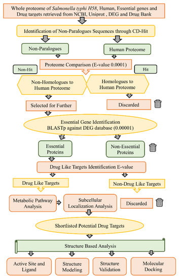 In the current study, a subtractive genomics analysis approach was applied against S. Typhi XDR strain H58 to prioritize novel drug targets []. The complete workflow of the current study is presented in Figure 1. Subtractive genomics is an in silico approach used to gradually reduce the whole proteome of a pathogen to a few potential and novel proteins that can act as drug targets.