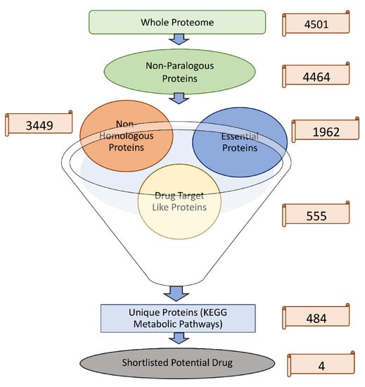 Often bacteria find alternative mechanisms to bypass the drug action. That is why the development of new drugs for existing drug targets is not a suitable approach for treating the disease []. Several potential drug targets can be investigated to cure highly pathogenic diseases by performing genome and proteome analysis. However, comparative genomic analysis is a challenging task because of its high cost. Computational approaches have eased these difficulties to some extent by data mining methods. One of the widely applicable computational approaches is the subtractive genomics that can be applied to evaluate the suitability of a new drug target based on essentiality and selectivity. This approach includes searching for new drug targets among previously identified proteins specific and essential to a particular pathogen [,,]. In doing so, the following steps are involved: