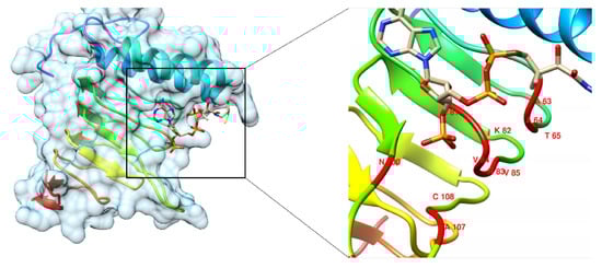 The post docking analysis was performed with the help of MOE software. The results showed that the active site residues Gln61 mediates hydrogen bond with OH group of Ribose, Asn37 makes a hydrogen bond with NH group, Asn81 formed two hydrogen bonds with two oxygen atoms of the phosphate group, Arg49, Lys82, and Asn100 mediate hydrogen bonds with seven oxygen atoms of three phosphate groups, Ala42 make one hydrogen bond with OH group and another hydrogen bond with carbonyl oxygen, and Trp40 mediates a hydrogen bond with carbonyl oxygen.