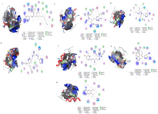 From the above virtual screening, seven compounds, i.e., Acetoxy-(10)-gingerol, 1-(4-Hydroxy-3-methoxyphenyl)-3,5-diacetoxyoctane, (6)-Gingerdiol acetate methyl ether, Feruloylcholine,4-(3-Hydroxy-7-phenyl-6-heptenyl)-1,2-benzenediol, Tetramethylquercetin, and Isosalsolidine were shortlisted as lead drug molecule against Colanic acid biosynthesis acetyltransferase based on their ADME, toxicity, drug-likeness and Lipinski rules predicted through PreADMET, and FAFDrug4 tool. These seven shortlisted natural product compounds are the main constituents of edible plants such as ginger, garlic, turmeric, oregano, etc. The identified gingerol compounds ((6)-Gingerdiol acetate methyl ether, Acetoxy-(10)-gingerol) are traditionally used [] for the treatment of cancers, dyspepsia and are widely evaluated against Bacillus spp., Escherichia coli, Staphylococcus aureus, and periodontal bacteria for their antimicrobial activities [,]. Moreover, Feruloylcholine (having a curcumin moiety) is also reported for its antimicrobial activity against Gram-positive (S. aureus and B. subtilis) and Gram-negative (S. Typhi and K. pneumoniae) []. Additionally, Silva et al. recently reported the antifungal activity of Tetramethylquercetin []. These shortlisted seven compounds were subjected to molecular docking through MOE for detailed study, and it showed binding energies ranging from ~−5 to −7 Kcal/mol. The hydrogen bonding and hydrophobic interactions with Colanic acid are shown in Figure 6. The shortlisted compounds, along with the binding energies, were presented in Table 5. The ADMET properties of these shortlisted compounds were presented as Supplementary Table S2. All the parameters were found in favor of the drug-like characteristics of the shortlisted seven compounds.