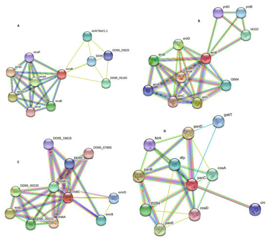 PPIs of Colanic acid (A), Shikimate Dehydrogenase (B), MdtC Protein (C), and panC Protein (D). Protein-protein interaction of identified novel drug targets.