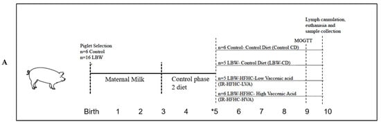 Pigs, balanced for litter, were gradually switched onto their treatment group diets (see Table 1 and Table 2 for diets) at week 5 with experimental groups as follows (metabolic type/diet): Control-Control Diet (Control-CD, n = 6), LBW-Control Diet (LBW-CD, n = 5), LBW fed high-fat, high-carbohydrate, low vaccenic acid diet denoted as Insulin Resistant-HFHC-LVA (IR-HFHC-LVA, n = 5) and LBW fed high-fat, high-carbohydrate diet with high VA denoted as Insulin Resistant-HFHC-HVA (IR-HFHC-HVA, n = 6). At 8 weeks of age the pigs were fasted overnight and jugular catheters were implanted as previously described [11]. An adapted 2-step modified oral glucose tolerance and fat challenge test (MOGTT) was conducted at 9 weeks of age. Pigs were anesthetized at 10 weeks of age, lymph was sampled, and tissues were collected after euthanasia (Figure 1).