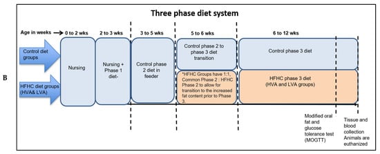 Pigs were fed diets in a three-phase system as shown in Table 1 and Figure 1. From 2–3 weeks of age pigs were fed a phase 1 diet, which is crumbled solid feed and is introduced by creep feeder. From 3 to 5 weeks of age all pigs were on a control phase 2 diet, fed from feeder. At 5 weeks of age, control diet groups were switched to phase 3 control diet. However, for the HFHC diet groups, the diets were gradually transitioned, to allow the pigs to accommodate to the changing diet. For HFHC groups, HFHC phase 2 diet (respective HVA and LVA diets) partially started at 5 weeks (mixed 1:1 with control Phase 2 diet), and was completely switched to HFHC phase 3 diet at 6 weeks Phase 2 and 3 of the HFHC-HVA diets were made using fat obtained from the Lacombe Research and Development Center, Lacombe, Alberta, Canada. Peri-renal fat was collected from steers fed extruded flaxseed (25%) and hay (75%) sequentially, as previously described [12]. Phase 2 and 3 of the control and HFHC-LVA diets were made with peri-renal fat without VA, which was obtained from a commercial packing plant from steers fed a high barley-grain diet. Methods for fat collection and rendering are as previously described [13]. Fatty acid composition of the diet (Table 2) was determined as previously described using an adapted method [13,14]. The diets were formulated to meet or exceed nutrient requirements of starter pigs [15] (Table 1). Pigs were given ad libitum access to feed and water.
