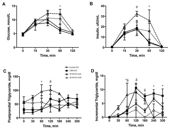 (A) Postprandial glucose and (B) insulin response following a modified oral glucose challenge. Values are means ± SEM, n = 6 Control-Control Diet (CD) (black circles), n = 4 LBW-CD (black squares), n = 3 IR-HFHC-LVA (open triangles), n = 4 IR-HFHC-HVA (open diamonds). (*) denotes statistical difference between LBW-CD and IR-HFHC-LVA (p value < 0.05). (ϕ) denotes trend between IR-HFHC-LVA vs. IR-HFHC-HVA (p value = 0.09) (C) Postprandial triglyceride and (D) incremental triglyceride response following a modified oral glucose and fat challenge (MOGTT). Values are means ± SEM, n = 6 Control-CD (black circles), n = 4 IR-CD (black squares), n = 3 IR-HFHC-LVA (open triangles), n = 4 IR-HFHC-HVA (open diamonds). AUC is shown (inset). (*) denotes statistical difference between LBW-CD and IR-HFHC-LVA (p value < 0.05) and (δ) denotes statistical difference between IR-HFHC and IR-HFHC-HVA (p value < 0.05).