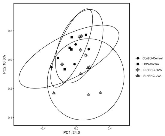 A total of 1,519,492 reads, with an average of 49,685 reads per sample were obtained for a total of 4143 amplicon sequence variants. One sample from the Control-Control group was removed due to low quality sequence data. Principal coordinate analysis (PCoA) of cecal microbiota composition using Bray–Curtis metrics (Figure 3) showed LBW pigs fed IR-HFHC-LVA diet had a significant shift in cecal microbial composition (ADONIS, R2 = 0.235, p = 0.003), while the addition of VA to the IR-HFHC diet normalized the IR-HFHC-LVA diet-induced shift and were not different from pigs fed the control diet.