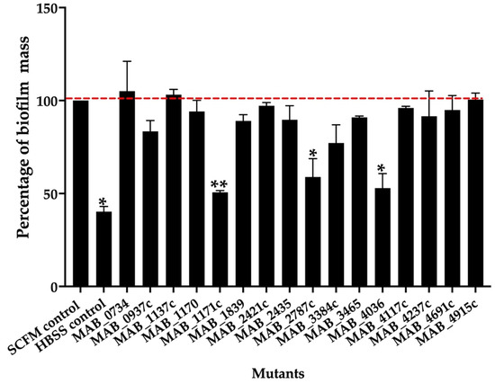 The percentage of biofilm mass for MAB mutants belonging to the surface transport systems. The biofilm mass of the MAB wild-type and transposon mutants were quantified at day 7 with 0.1% crystal violet staining and solubilization of 30% acetic acid, and the measurements were recorded at OD570. The percentage of biofilm formation was normalized to the positive control, representing the MAB 19977 biofilm mass in SCFM (dashed red line), while the MAB 19977 biofilm mass in HBSS represents the negative control. Data represents the mean SD of wells assayed in duplicate and with three biological replicates. Significant differences were observed between the positive biofilm of MAB 19977 in SCFM and the negative control in HBSS (* p < 0.05), MAB_1171c (** p < 0.01), MAB_2787c (* p < 0.05), and MAB_4036 (* p < 0.05).