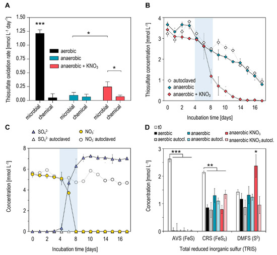 The highest potential for microbial thiosulfate oxidation in tailings material was measured in aerobic incubations with a rate of 1.21 ± 0.09 mmol L−1 day−1 (Figure 1A). Under these conditions, chemical transformation (quantified in autoclaved assays) accounted for ~4% (0.05 mmol L−1 day−1) of thiosulfate turnover. In anaerobic microcosms, the rate of thiosulfate transformation was significantly lower (0.09 ± 0.08 mmol L−1 day−1; p < 0.0001) and dominated by chemical reactions (~78%), as seen in the autoclaved controls (Figure 1A,B). Maximum SO42− accumulation in these assays amounted to 2.81 mmol L−1 (not shown). Hence, considering a theoretical production of 7.5 mmol L−1 SO42− from the complete oxidation of 3.75 mmol L−1 thiosulfate, only 37% of thiosulfate was oxidized in anaerobic incubations. This indicates the presence of other transformation processes, i.e., the reduction or disproportionation of thiosulfate, commonly found in anoxic sediments [24]. The addition of KNO3 (4 mmol L−1) to anaerobic microcosms significantly increased the rate of thiosulfate transformation (0.23 ± 0.09 mmol L−1 day−1; p = 0.0474), with a latency of ~4 days (Figure 1A,B). Thereby, complete oxidation to SO42− occurred in close association with a decrease in added NO3−, while concentrations of both compounds were stable in autoclaved assays until the end of incubation at day 14 (Figure 1C).