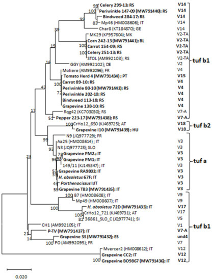 - Jamshidi, E.; Murolo, S.; Salehi, M.; Romanazzi, G. Sequence analysis of new tuf molecular types of ’Candidatus Phytoplasma solani’ in Iranian vineyards. Pathogens 2020, 9, 508. [Google Scholar] [CrossRef]