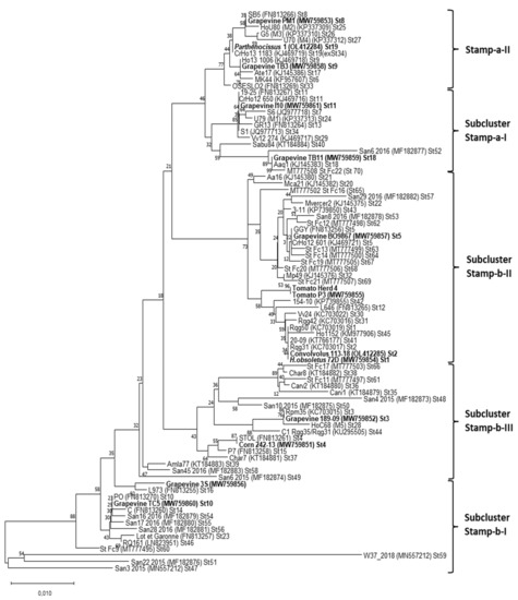 The RFLP analysis conducted on stamp gene amplicons revealed the presence of five profiles (Table 2). A phylogenetic tree was constructed using representative nucleotide sequences of the stamp gene obtained in this study and 70 stamp sequences retrieved from previous studies [19,27,44,46]. The phylogenetic analysis showed the presence of 11 stamp variants (St1-3, St2-11, St3-2, St4-3, St5-8, St8-4, St9-1, St10-2, St11-2, St18-2, and St19-6) determined by comparison with the available stamp gene dataset [44,46]. Two variants identified in tomato from Portugal and grapevine from Spain were found for the first time in the present study and were deposited at NCBI GenBank with the accession numbers MW759855 (tomato P3) and MW759856 (grapevine 3S) (Table 3).