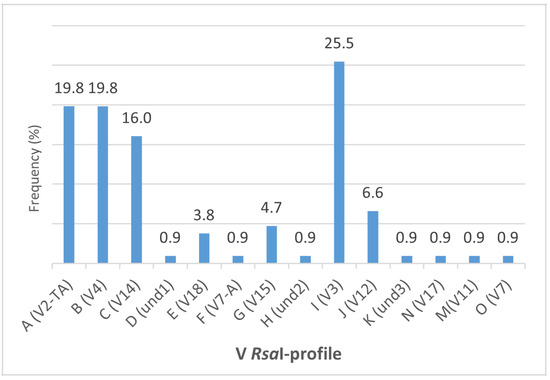 A phylogenetic tree was constructed with 26 vmp1 gene sequences representing the different RFLP profiles observed, and 18 strains retrieved from NCBI GenBank database representing the vmp1 gene profiles according to the literature [11,28]. The sequences generally clustered according to the RFLP profiles (Figure 1). Only the two samples (strain P-TV from Italy and pepper 223-17 from Serbia) that exhibited a 1,200 bp fragment after nested TYPH10F/R PCR on vmp1 gene showed an identical RsaI restriction profile (Figure 2); while in the phylogenetic tree, they appeared to cluster separately (Figure 1). These two strains were differentiated by AluI virtual digestion (data not shown) and resulted in the V7-A and V7 profiles, respectively [11]. The enzymatic digestion with RsaI on vmp1 gene amplicons allowed the identification of 14 RFLP profiles (Table 2), according to 23 V-types reported in previous studies [11,28,31]. Furthermore, three vmp1 gene amplicon sizes were obtained, approximately 1,700, 1,450, and 1,200 bp long. The largest polymorphism was found in the 1,450 bp amplicons, for which 10 RFLP profiles were differentiated (V2-TA, V3, V4, V11, V14, V15, V18, V17, und1, und2, and und3); on the other hand, only the profiles V7 and V7-A from the shortest amplicon and V11 and V12 from the longest were detected (Figure 2).