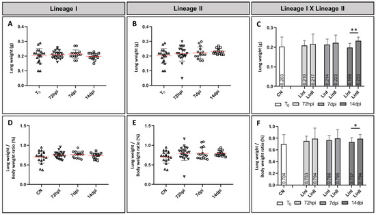 Mean lung weight (A–C) and lung weight/body weight ratio (%) (D–F) of BALB/c mice noninfected and infected with DENV-2 lineages at 72 hpi, 7 dpi and 14 dpi. CN: (N = 19); LinI: 72 hpi (N = 22), 7 dpi (N = 15), 14 dpi (N = 15); LinII: 72 hpi (N = 22), 7 dpi (N = 15), 14 dpi (N = 15). NC: negative control, T0: before infection, hpi: hours post-infection, dpi: days post-infection, Lin: lineage, *: p < 0.05, **: p < 0.01.