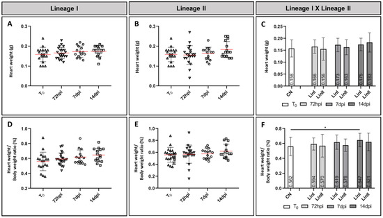 Mean heart weight (A–C) and heart weight/body weight ratio (%) (D–F) of BALB/c mice noninfected and infected with DENV-2 Lineages at 72 hpi, 7 dpi and 14 dpi. CN: (N = 19); LinI: 72 hpi (N = 22), 7 dpi (N = 15), 14 dpi (N = 15); LinII: 72 hpi (N = 22), 7 dpi (N = 15), 14 dpi (N = 15). NC: negative control, T0: before infection, hpi: hours post-infection, dpi: days post-infection, Lin: lineage, *: p < 0.05.