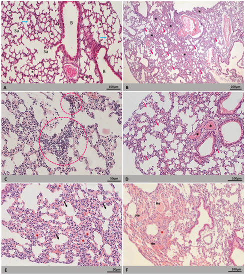 Histopathological alterations of lung of BALB/c mice. H&E staining. Euthanasia; 72 hpi. (A) Noninfected mouse. Alveolar sac (Sa), alveolar septum (arrow), alveolus (*), bronchiole (B). (B–D) Mice infected with DENV-2 lineages: (B) alveolar septa thickening (*), alveoli hyperinflation (arrow); (C) inflammatory infiltrate (circled area); (D) vascular congestion (*), alveoli hyperinflation (arrow); (E) alveolar edema (*), vascular congestion (arrow); (F) hemorrhage (He), edema (*). Experimental infection: (B,C,E) Lineage I, (D,F) Lineage II.