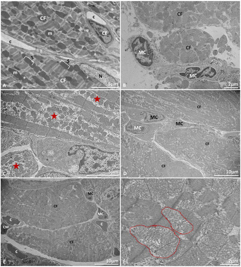 Ultrastructural alterations of heart of BALB/c mice. Euthanasia; 72 hpi. (A) Noninfected mouse. Cardiac fibers (CF), nucleus (N), mitochondrion (m), sarcomere (s), endothelial cell (CE), capillary (c). (B) Mononuclear cells (MC). (C) Degeneration of myofilaments (star). (D) mononuclear cells infiltration (MC). (E) Capillary congestion (C), mononuclear cells (MC). (F) Mitochondrial tumefaction (arrow). Experimental infection: (B) Lineage I, (C–F) Lineage II.