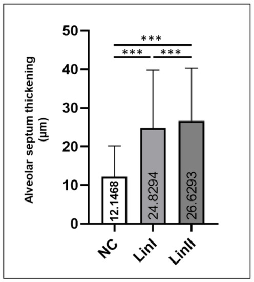 Morphometrical analysis of alveolar septum of infected and noninfected BALB/c mice. Euthanasia: 72 hpi. NC: negative control, Lin: lineage, hpi: hours post-infection, ***: p < 0.001.