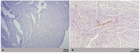 DENV antigen detection in heart of BALB/c mice infected with DENV-2 Lineage II. Euthanasia: 72 hpi. (A) Negative control showing no peroxidase reactive cells; (B) peroxidase-reactive endothelial cells (black arrow) and cardiomyocyte (red arrow).