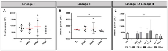Creatine kinase (CK) levels present in serum from BALB/c mice noninfected (T0) and infected with DENV-2 strains I or II 24, 48 and 72 hpi. (A) Lineage I of DENV-2; (B) Lineage II of DENV-2; (C) comparison of mean creatine kinase levels. CN: negative control, Lin: lineage, hpi: hours post-infection, *: p ≤ 0.05.