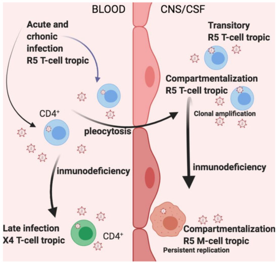 Viral compartmentalization, diverse in viral populations at the genetic level, can be identified in the CSF/CNS during the progression of infection, and replication occurs in the periphery [104]. Two important classifications of compartmentalization have been explored in previous studies [105]. The first is clonal amplification, characterized by the fast growth of genetically analogous variants producing a CSF viral population of minor complications. These viral populations demand elevated levels of CD4 for entry and are CCR5 (R5)-using T cell-tropic viruses [106] (Figure 2). Clonally amplified populations have been discovered as early as two to six months post-infection during the primary infection [107]. Another more complicated classification of CSF viral compartmentalization has also been described, frequently made up of macrophage-tropic viruses. These more genetically complex populations frequently coincide with a prolonged time since virus infection, demonstrative of a more extensive stage of isolated replication and development of the population and entry phenotype [108].