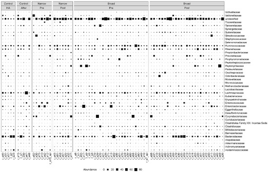 Taxonomic composition at the family level. Bubble plot showing the abundance estimates for the 78 samples included in the analysis. MGS abundances were summarized at the family level and shown separately for each antibiotic spectrum at each timepoint. The relative abundances are in percentages. HA: hospital admission.
