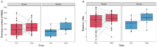 The effect of antibiotic treatment on the diversity within a sample (alpha diversity) was studied by comparing MGS richness and the Shannon index (Figure 2). We observed an increase in richness (Wilcoxon signed-rank test, p = 0.016) and a tendency for an increase in the Shannon index (Wilcoxon signed-rank test, p = 0.078) for the narrow-spectrum samples (Figure 2).