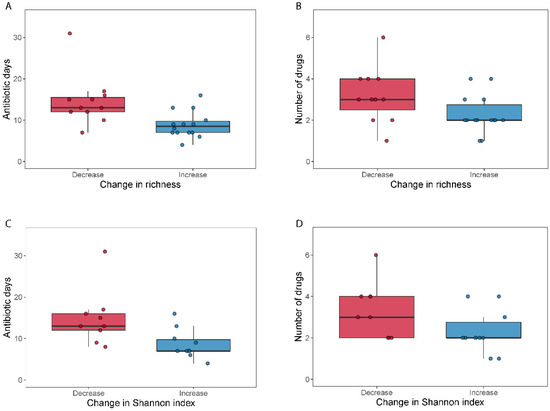 We observed a significant increase in diversity for patients in the narrow-spectrum group as well as a tendency for an increase in the Shannon index, which may indicate that the removal (killing) of some specific bacterial species allowed for other species to proliferate and occupy the emptier niche, maintaining what could be viewed as a well-balanced microbiota. Supporting this we observed a nominally significant increase of 15 microbes, mostly from the Bacteroides and Clostridium genera, in the narrow-spectrum treatment, which only maintained their levels in the broad-spectrum treatment. In contrast, we found no statistically significant differences in diversity (neither as richness nor as Shannon index) within the broad-spectrum antibiotic group, and generally the richness and Shannon index were more varying in this group. There was, however, a tendency among the patients with decreased richness and Shannon diversity to have had administered a higher number of drugs. It would have been expected that the broad-spectrum treatment had a larger effect on the intestinal composition compared to a narrower treatment. This was not the case and could reflect non-homogenous patient group characteristics (i.e., degree of illness, number of parallel treatments or number of medical drugs used at the same time) as there was no controlled standardized recruitment process. We had too few primary diagnoses recorded to compare between groups, yet for the recorded primary diagnoses we found no differences. Three patients in the increased group had a comorbidity noted regarding alcohol overconsumption, which is known to lower the diversity. One could speculate that stopping alcohol consumption during hospitalization could lead to an increase in diversity; however, this should be investigated in a new study.