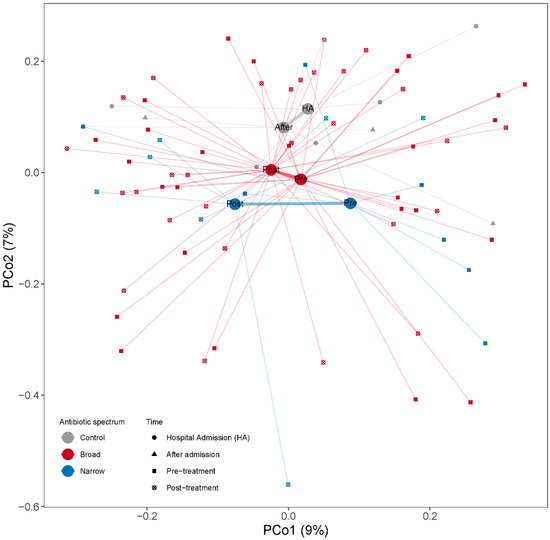 PCoA based on Bray–Curtis dissimilarities among samples calculated from MGS relative abundances to illustrate changes in microbial community composition between the samples. Samples are color coded by the antibiotic treatment (Control, Broad and Narrow spectrum). The mean of all the samples belonging to each antibiotic treatment group is indicated with a larger dot (centroid). All samples belonging to the same antibiotic treatment point are connected by a thin line to their respective centroid. Centroids from the same antibiotic spectrum are connected by a thicker line. The x- and y-axes show the microbial variance explained by each principal coordinate.