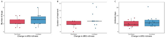Number of antibiotics used (A), duration of antibiotic treatment (B) and total antibiotic days (C) relative to change in ARG richness. Boxplots show the number of antibiotics (A), the duration of treatment (B) and the total days on antibiotics (C) for patients who either decreased (“Decrease”) or increased (“Increase”) their ARG richness during broad-spectrum antibiotic treatment.