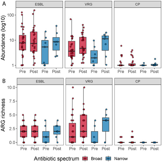 To determine how many patients carried resistance genes belonging to extended-spectrum beta-lactamases (ESBL), vancomycin resistance genes (VRG) and carbapenemase-production (CP), we grouped all the beta-lactamases, except the ones that hydrolyze carbapenem and cephamycins into the ESBL group (in total 36 genes), all vancomycin resistance genes (in total 216 genes) and all carbapenem resistance genes into the CP group (in total 10 genes). We then counted how many patients carried at least one resistance gene belonging to one of these three groups at pre- or post-treatment; how many resistance genes assigned to these classes were detected (abundance > 0) in the samples; and we summed up the abundances of genes belonging to each of the three groups, to investigate the change in abundance of these groups during the antibiotic treatment (Figure 6). When we compared ESBL, VRG and CP richness and abundance between pre- and post-treatment for each antibiotic spectrum, we did not find any significant statistical difference (Table S4). However, when we pooled all samples belonging to pre- and post-treatment, irrespective of the treatment, and compared the two timepoints, we observed a tendency of a higher number of vancomycin resistance genes post-treatment (Wilcoxon signed-rank test; p = 0.063).