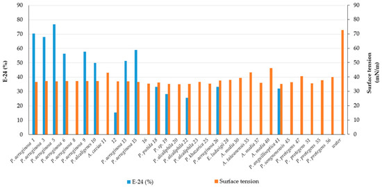 On the other hand, the results of surface tension, measured by the Wilhelmy Plate method, showed a lower variability between strains, detecting values from 35 to 46 (mN·m−1) (Table 1). Figure 1 shows the emulsification indexes E-24(%) and the surface tension activity of the detected “bioactive” intestinal bacteria.