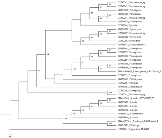 Bacterial isolates were identified by partial 16S rRNA gene sequencing. Bacterial cell preparation for DNA extraction were performed using a Qiagen kit (DNeasy® Blood & Tissue Kit, Hilden, Germany). Universal primers designed to amplify approximately 1300 bp of Escherichia coli 16S rRNA gene were used [34]. The sequences were: forward primer 63f (50 -CAG GCC TAA CAC ATG CAA GTC-30) and reverse primer 1387r (50 -GGG CGG WGT GTA CAA GGC-30). PCR mixture contained from 50 to 100 ng DNA template, 1 µL of each primer (50 pmol µL−1) (Sigma Genosys, The Woodlands, Texas, USA) and 20 µL of ready-to-use PCR master mix containing Taq polymerase (MegaMix 2MM-5, µ Microzone Limited, Stourbridge, UK), to give a total reaction of 25 µL. The PCR conditions were: 30 cycles of denaturation at 94 °C for 1 min, annealing at 58 °C for 1 min and elongation at 72 °C for 2 min, with a final elongation at 72 °C for 10 min. Purification of the amplicons for sequence study was carried out as described in the Qiagen (QIAquick® PCR Purification Kit, Hilden, Germany) protocol. Partial sequences were determined by BMR Genomics s.r.l (Padova, Italy). The sequencing results were submitted for homology searches by BLAST (Basic Logical Alignment Search Tool) [35] after unreliable sequences at the 3′ and 5′ ends were removed using the software Chromas, version 1.43 (Griffin University, Brisbane, Qld, Australia). The NCBI GenBank nucleotide database (National Center for Biotechnology Information, http://www.ncbi.nml.nih.gov accessed on October 2021) was used for sequence pairing. The identities were determined on the highest score basis. Nucleotide sequences were deposited in the NCBI GenBank database under the accession numbers MW369461- MW369487 [11] and OK342256-OK342267 (This study). A phylogenetic tree was reconstructed using the 16S rRNA gene sequences obtained in the study and the reference strains ENA AF094713 P. aeruginosa ATCC 10145T, ENA X60410 Aeromonas media ATCC 339007T and ENA AJ853891 Enterobacter ludwigii DSMZ 16688T. As an out-group, the strain NR074804 Cellvibrio japonicus strain Ueda 107 was utilized for the analysis [36]. A Clustal W Multiple alignment was obtained by MEGA X [37]. The final dataset was included using 820 bp positions. The best fit DNA evolution model selected on the IQTREE webserver [38] was K2P G4 [39]. A phylogenetic tree was inferred by the Maximum Likelihood algorithm [40,41] in IQTREE with default parameters. The bootstrap test (1000 replicates) [42] was used to evaluate the robustness of the tree topology.