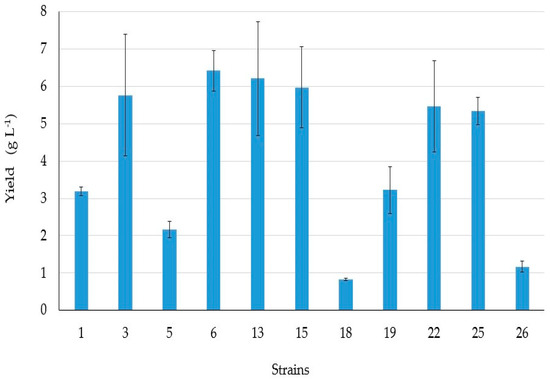 Figure 3 shows the BSs yield extracts of representative intestinal bacteria. The BS producers which gave the highest yield extracts (values from 6–6.42 g L−1) were strains 6, 13, 15.