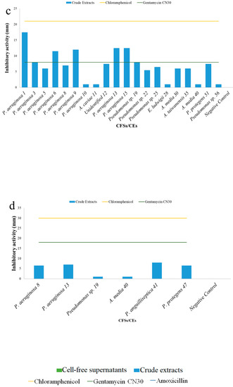 Inhibitory activity exhibited against the target S. aureus H1610 (a), P. mirabilis H1643 (b), K. pneumoniae H1637 (c) and A. hydrophila H1563 (d) by concentrated supernatants (CFSs green) and crude extracts (CEs blue) obtained by bacterial isolates.