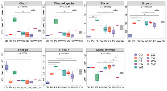 Alpha diversity of the microbiota associated with fish gut, diet, and environmental compartments. Boxplots of microbial community from different groups are outlined in different color; boxes cover the interquartile range (IQR) and the line inside the box denotes the median. Whiskers represent the lowest and highest values within 1.5× IQR. CD, diet for cage-cultured fish; CG, gut of cage-cultured fish; CW, water from cage culture area; PD, diet for pond-cultured fish; PG, gut of pond-cultured fish; PS, sediment from pond; PW, water from pond; WG, gut of wild-caught fish; WW, water from natural sea area. Asterisk indicated significant difference between two groups, among them, * indicates p < 0.05, **, indicates p < 0.01, ***, indicates p < 0.001.