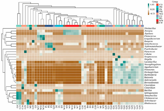 Heatmap showing genus-level microbial composition. The relative abundance shown represents the mean relative abundance for the corresponding group.