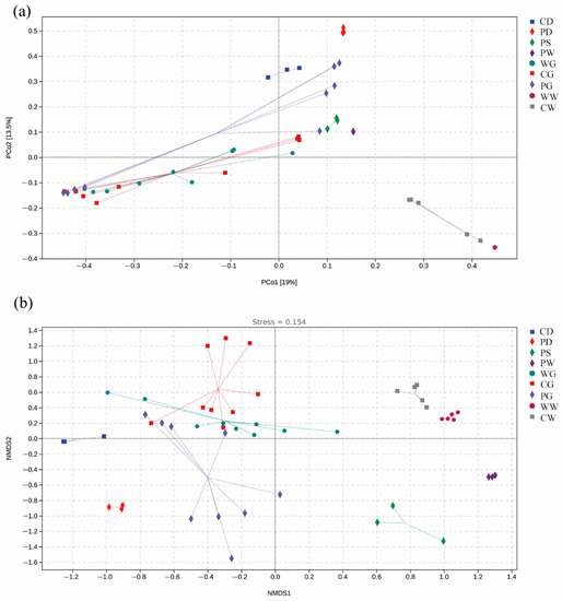 Distributions of the microbial communities of the different groups. (a) principal coordinates analysis (PCoA); (b) nonmetric multidimensional scaling (NMDS) analysis.