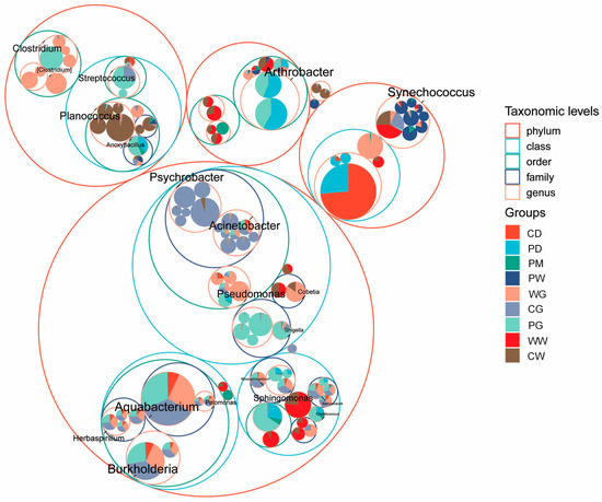 However, analyses showed that certain microbes were shared among groups, indicating connections between the gut microbiota and those from other sources. That is, a circle packing chart of the genus-level microbial communities of the gut, diet, and environmental compartments (Figure 4) showed that Synechococcus was found in all of the gut, sediment, and water samples; Arthrobacter dominated the PD and PG groups, but was also found with low relative abundances in the PS and CD groups; Planococcus dominated the CW group, but was also found in the WG and CG groups; Psychrobacter dominated the CG group, but was also found in the WG and CW groups; and Anoxybacillus and Chelatococcus were found together in the PG, PD, and PS groups. Several species were found only in specific groups: Psychrobacter pacificensis and Psychrobacter celer were only found in the CG and CW groups; Pseudomonas alcaligenes was only found in the PG, PD, and PS groups; Sphingomonas yabuuchiae dominated the PD and PG groups; Photobacterium damselae, Paracoccus aminovorans, and Paracoccus zeaxanthinifaciens were only found in the WG group; Psychrobacter pulmonis and Lawsonia intracellularis were only found in the CG group; Streptococcus agalactiae was only found in the PG group; and Pseudomonas fragi, Ruegeria lacuscaerulensis, and Anaerospora hongkongensis were predominant in the WG group, but were also found in the CG group with relative abundances.