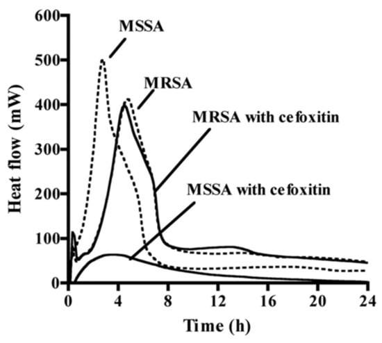 The different heat profiles obtained by microcalorimetry of methicillin-susceptible S. aureus (MSSA) and methicillin-resistant S. aureus (MRSA) in the presence (solid lines) or not (dashed lines) of the antibiotic cefoxitin (from [35], adapted with the permission of the American Society for Microbiology, 2021, conveyed through Copyright Clearance Center, Inc., Danvers, MA, USA).