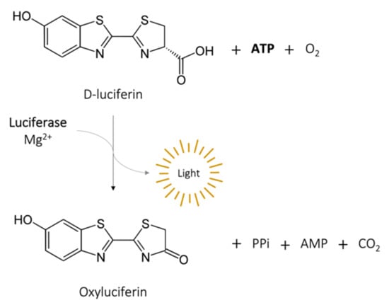 The measurement of adenosine triphosphate (ATP) produced by bacteria to determine cell viability, provides reliable DST results in a matter of hours, a great breakthrough from conventional methods [38,39]. The intracellular ATP in bacteria can be assessed by the ATP bioluminescence assay, which is based on the conversion of D-luciferin in oxyluciferin by luciferase in the presence of ATP and Mg2+, generating light [11] (Figure 3). The BacTiter-Glo microbial viability assay (Promega, Madison, WI) is a commercial kit with this principle. After incubation in the presence or not of the drug of interest, bacteria are mixed with a cocktail that contains a lysis buffer, luciferase, and D-luciferin. A luminescent signal will be produced, which is proportional to the intracellular ATP concentration and bacterial viability. It is recorded by a microtiter luminometer, or other instruments that measure luminescence and translated into relative light units (RLU). This method is particularly suitable for high-throughput assays. Cai et al. [40] tested six antibiotics alone and in combination against 100 strains of carbapenem-resistant Acinetobacter baumannii, Pseudomonas aeruginosa, and Klebsiella pneumoniae using the BacTiter-Glo assay and compared the results with a conventional CFU assay. Within 24 h, the bioluminescent assay identified inhibitory/non-inhibitory antibiotic combinations with an overall accuracy of 91%. Kapoor et al. [41] adapted the same assay for three rapid-growing mycobacteria (M. immunogenum, M. chelonae, and M. abscessus) and reported a linear relationship (r2 = 0.99) between intracellular ATP (RLU) and bacterial load (CFU/mL). Importantly, the BacTiter-Glo assay gives results in 1.5 h, compared to the 3 to 5 days required for these species by CFU assay. Using a similar luciferin–luciferase reagent, Beckers et al. [42] showed results for M. tuberculosis after 5 days of incubation instead of the 3 to 4 weeks required by a standard dilution method. Dong et al. [43] applied the BacTiter-Glo assay to personalized medicine using a microfluidic simulator that captures urinary tract pathogens from a urine sample with antibodies trapped on a membrane and measures ATP bioluminescence after antibiotic treatment. The specificity and rapidity of this method allowed the identification of the pathogens within 20 min and the evaluation of the antiseptic effects of eight antibiotics within 3 to 6 h.