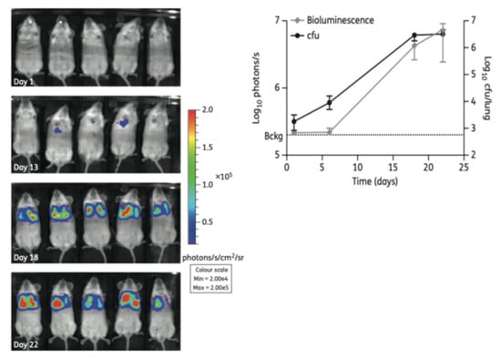 (Left): Non-invasive longitudinal monitoring of mice infected with a FFluc M. tuberculosis reporter strain after intraperitoneal injection of D-luciferin (IVIS® Spectrum system). (Right): The bioluminescent signal obtained by live imaging correlates with CFU counting (from [47] under the terms of a CC BY-NC 3.0 license: https://creativecommons.org/licenses/by-nc/3.0/) (accessed on 8 December 2021).