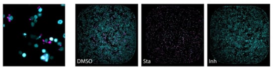(Left): Macrophages (nuclei stained with SYBR Green I–in cyan) infected with M. tuberculosis expressing a red fluorescent protein (DsRed) in magenta, analysed by high-content screening technology. (Right): The effect of treatments in macrophage and M. tuberculosis viability assessed by the same technique (entire well in one frame): both cells are viable in the presence of DMSO alone; most macrophages are killed by the cytotoxic compound staurosporine (Sta), and the viability of M. tuberculosis is significatively affected by the presence of the antimicrobial isoniazid (Inh) (from [52] under the terms of a CC BY 4.0 license: https://creativecommons.org/licenses/by/4.0/) (accessed on 8 December 2021).