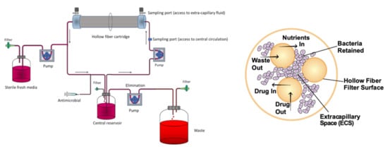 (Left): Schematic representation of a hollow fiber model system to study PK–PD properties of antimycobacterial compounds (from [62] under the terms of a CC BY 4.0 license: https://creativecommons.org/licenses/by/4.0/) (accessed on 8 December 2021). (Right): Cross-section of a hollow fiber cartridge, showing the bacteria trapped in the peripheral compartment, in contact with antibiotic and nutrients that can cross the fiber surface (from [63] under the terms of a CC BY 4.0 license: https://creativecommons.org/licenses/by/4.0/) (accessed on 8 December 2021).