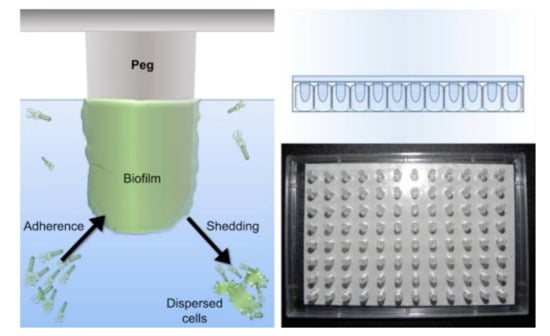 (Left): schematic representation of the MBEC Assay®, showing the bacteria on culture medium adhering to the peg on the lid of the plate and forming a biofilm. (Right): photo and representation of the lid containing 96 pegs, which fits any standard 96-well plate (from Innovotech®-http://www.innovotech.ca/) (accessed on 8 December 2021).