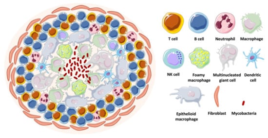 In vivo infection with mycobacteria is characterized by the formation of immune cellular organized aggregates called granulomas. These aggregates contain mainly specialized macrophages, such as high-lipid content foamy macrophages, large cytoplasm epithelioid macrophages, as well as multinucleated giant cells. This structure forms when mycobacteria are internalized by the host macrophages that start secreting cytokines and chemokines. Peripheral monocytes and T-lymphocytes are recruited to the site of infection, where the lymphocytes surround, together with a coat of fibroblasts and collagen, a core of differentiated macrophages, monocytes, neutrophils, dendritic cells, and intracellular or free mycobacteria [81,82] (Figure 12). The mycobacteria inside the hypoxic environment of the granuloma develop into a dormant state, characterized by the accumulation of intracytoplasmic lipid inclusions, loss of acid fastness, and resistance to the antibiotic rifampicin [81]. This bacterial phenotype is very difficult to replicate in vitro.