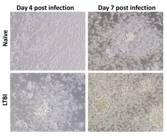 Light microscopy images (×40 magnification) of granuloma formation being influenced by the origin of the PBMCs. After infection with M. tuberculosis, PBMCs from individuals with latent TB aggregate into granulomas earlier than PBMCs from naïve individuals (from [93] under the terms of a CC BY-NC-SA 3.0 license: https://creativecommons.org/licenses/by-nc-sa/3.0/) (accessed on 8 December 2021).