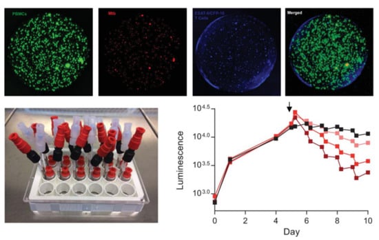 (Top): alginate–collagen microspheres with early-stage granulomas formed by human PBMCs infected with M. tuberculosis created by Bielecka and Tezera et al. PBMCs labelled with CellTrace CFSE (green); M. tuberculosis expressing a red fluorescent protein (mCherry); autologous ESAT-6 specific T cells labelled with CellTracker Blue. (Bottom left): Microfluidic system developed by the same group to study the pharmacokinetics of antibiotics against M. tuberculosis-infected granulomas inside microspheres. (Bottom right): Increasing concentrations of rifampicin (lighter to darked red, black represents a non-treated control), added at day 5 (arrow), accelerate the rate of M. tuberculosis death inside the granuloma, measured in a plate reader luminometer using a bioluminescent (lux) reporter strain (from [95] and [96] under the terms of a CC BY 4.0 license: https://creativecommons.org/licenses/by/4.0/) (accessed on 8 December 2021).