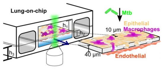 Schematic representation of the murine ALI lung-on-a-chip model with M. tuberculosis (green) infection adapted to microscopy imaging, established by Thacker et al. The upper compartment with air-exposed epithelial cells (yellow) represents the alveolar region of the lung and the lower compartment with endothelial cells (red) in contact with culture medium represents the vascular region. Fluorescent-tagged macrophages (magenta) can migrate through the porous membrane that separates the compartments. h1 = 1 mm, h2 = 250 mm, h3 = 800 mm (from [107] under the terms of a CC BY 4.0 license: https://creativecommons.org/licenses/by/4.0/) (accessed on 8 December 2021).