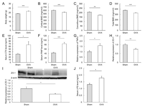 Eight-week-old C57BL/6J female mice were ovariectomized (OVX) or sham-operated (N = 5–10 per group) to evaluate estrogen-deficiency-induced osteoporosis, as previously described [21]. Briefly, a midline dorsal incision was made along the lumbar vertebrae, and the muscle on the flanks was cut to access the abdomen. The ovary, oviduct, and part of the uterus were removed through the incision and resected. The body weight of each group was measured weekly. The mice were sacrificed four weeks after surgery, and the blood, tissue samples from the jejunum and ascending colon, luminal contents of the jejunum and cecum, and left tibia were collected. The tibia was stored in 70% ethanol until further evaluation.